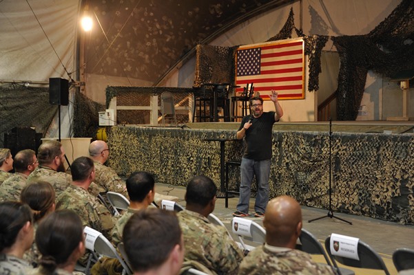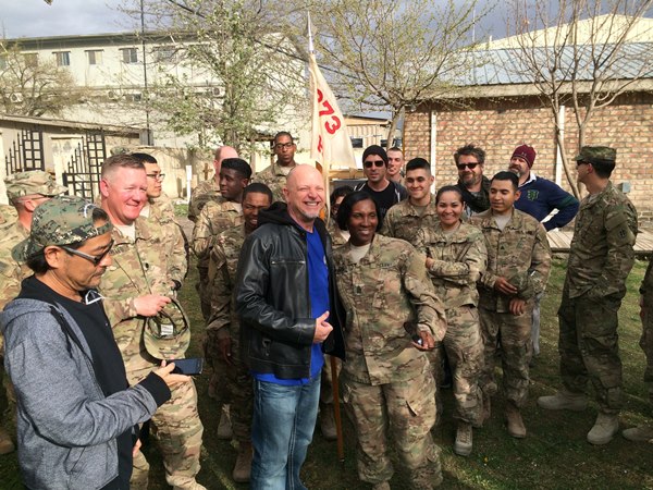 Oh, my gosh. Well, the hardest part is just that I was away from my wife and my kids. That was hard. Three-four weeks is a long time. But, then you think that the troops are deployed for a year. That shut me up about complaining about being gone. The other hard part was just… (laughs) this is going to sound funny, but the hardest part for me was just making sure that I got the laughs to start the show. I’m traveling with four comedians show do this night night, and I’m 22 years out. And I’m first, so I’ve got to go from zero to 35 miles an hour. I have to get the show started. I can BS my way through, do some crowd work, so that actually helped. I would write jokes about the base. But the pressure I put on myself, I was a one-man [film] crew with one camera. Sometimes I would use the camera that the base would use to film the show. I had sound gear. I knew the filmmaking. I knew the craft of filmmaking. I knew the story would present itself, but doing that standup comedy and getting some jokes that would really make them laugh, that was my biggest fear going over. More than getting killed.